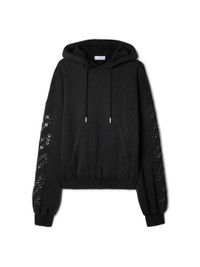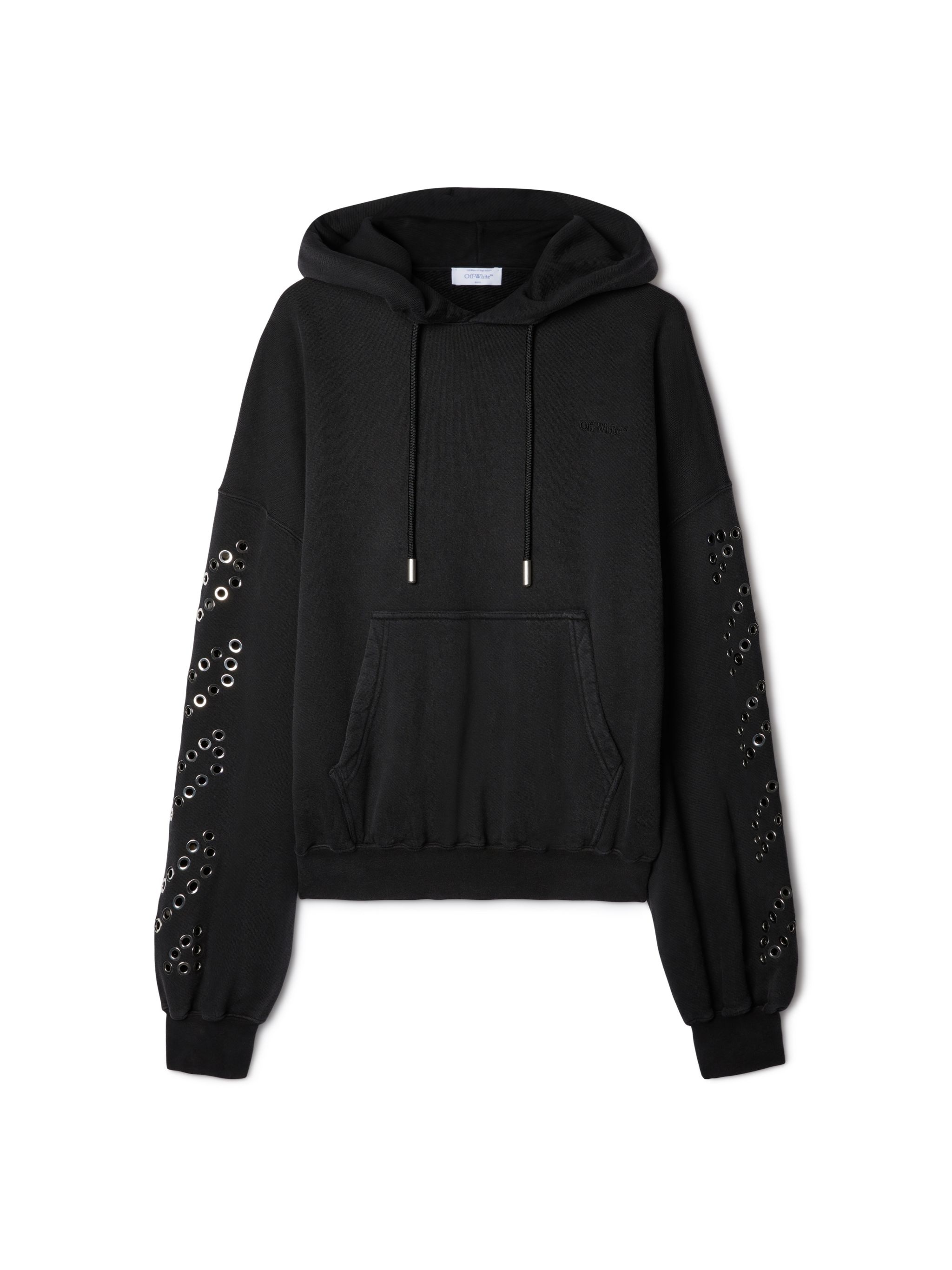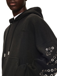 Long sleeves black hoodie with eyelet metallic diagonals at slevees.Knagoroo central pocket MATERIALS 100% Cotton FITTING Model Daniel Christian wears size M Height 6' 1" (186 cm) Chest: 34" (87 cm) Waist: 25" (65 cm)