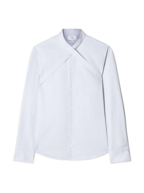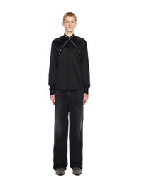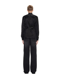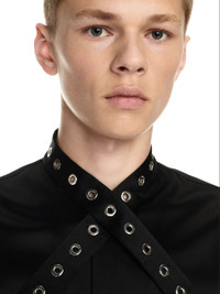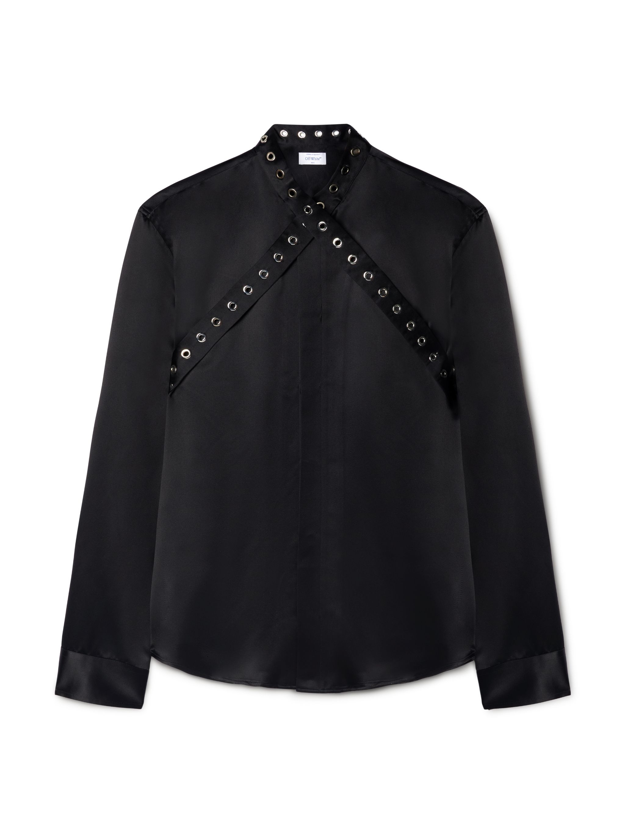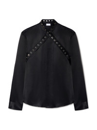 Black duchesse longsleeves shirt featuring tonal strap as collar with silver details. MATERIALS 100% Silk FITTING Model Daniel Christian wears size M Height 6' 1" (186 cm) Chest: 33" (85 cm) Waist: 27" (70 cm)