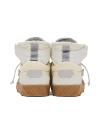 High-top paneled buffed leather, suede, and taffeta sneakers in white and off-white. · Perforated detailing at toe · Zip tie at lace-up closure · Leather logo patch at padded tongue · Padded collar · Logo graphic appliqué at outer side · Logo printed at inner side · Webbing pull-tab at heel counter · Bonded jersey lining · Transparent appliqué at rubber midsole · Treaded rubber outsole Supplier color: White/Cream
