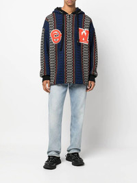 geometric-patterned alpaca-blend hoodie Off-White's vibrant character is encompassed in the design of this alpaca wool-blend hoodie. Woven in a busy geometric patterned jacquard, the piece features the brand's initials in varsity-style applique patches for a bold branded finish. Made in Italy Composition Wool 79%, Alpaca Wool 11%, Acrylic 10% SIZE & FIT Model measurements Height 6 ft 2 in(1.87 m) Bust/Chest 38.18 in(97 cm) Hips 36.61 in(93 cm) Waist 29.13 in(74 cm) FittingInformation This piece fits true to size. We recommend you get your regular size Cut for a loose fit Made with a mid-weight fabric Washing instructions Dry Clean Only