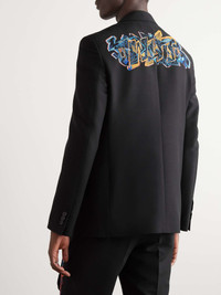 Off-White's suit jacket feels a tad cooler than traditional styles, thanks to the vibrant, graffiti-inspired logo embroidered at the hem and back. Darted for a trim fit, it's been tailored in Italy from a black wool-blend and has a signature hanging strap that's designed to look like a tie. Size & Fit - Model wears a size larger to achieve a looser fit - Mid-weight, slightly stretchy fabric - Model is shown wearing an IT 48 - Model measures: waist size 29, height 6'2"/ 188cm Details & Care - Black wool-blend - Notch lapels, non-functioning buttoned cuffs, front welt pockets - Two button fastening - 72% wool, 27% polyester, 1% acetate; lining: 100% viscose - Dry clean