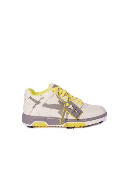 A new golf collection designed in collaboration with Paris Hilinski. These golf-edition Out Of Office sneakers are constructed with a leather and polyester upper and a rubber sole with cleats for traction on the course. The signature "ZIP-TIE" tag and a small tab on the side of the shoe feature golf tees with the new "ALL IN ONE" quote. MATERIALS Sole: 100% Rubber Outer: 89% Calf Leather Outer: 11% Polyester Lining: 82% Recycled Polyester Lining: 18% Polyester FITTING Bust 0cm Height 0cm Hips 0cm Waist 0cm