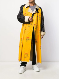 Industrial oversized trench coat Quench your need for a trench with this coat from Off-White. In a panelled design and mid-length, this piece is ideal for moving covertly through crowds and keeping track of your enemies. Just add a newspaper with eye-holes. Featuring panelled long sleeves, a double breasted front fastening, a notched collar, a rear central vent, an oversized fit, a long length and red Industrial prints all-over. Made in Italy Composition Outer: Cotton 100%, Polyamide 100%, Viscose 100% Lining: Cotton 70%, Polyurethane 30% SIZE & FIT Model measurements Height 6 ft 1 in(1.85 m) Bust/Chest 37.79 in(96 cm) Hips 37.4 in(95 cm) Waist 30.7 in(78 cm) FittingInformation This piece fits true to size. We recommend you get your regular size Cut for a loose fit Made with a mid-weight non-stretch fabric Washing instructions 0