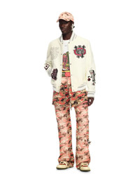 Part of the SS25 "DUTY FREE" runway collection, this varsity jacket is crafted from 100% leather with ribbed cuffs and collar. It features multiple crystal-embellished logos and graphics across the front, reverse and sleeves. Relaxed fit. MATERIALS 100% Viscose 100% Calf Leather 100% Cotton FITTING MOMO WEARS SIZE 48 HEIGHT: 6' 1” (185 CM) BUST: 37” (94 CM) WAIST: 29“ (74 CM) HIPS: 37” (96 CM)