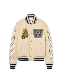 Exemplifying urban sophistication, the Lion Wool Varsity Jacket features intricate embroidery and a structured silhouette. - Wool-blend varsity jacket with premium construction - Front snap-button closure for streamlined fastening - Distinctive embroidered patches on the front - Iconic lion and logo applique on the back panel - Ribbed collar, cuffs, and hem for added comfort - Diagonal stripes along sleeves for visual interest - Side welt pockets for functional storage - Internal lining for enhanced wearability - Made in Italy DETAILS - Body Lining: 100% Viscose, Material: 25% Polyamide (Nylon) 75% Virgin Wool, Rib Details: 10% Polyamide (Nylon) 2% Elastane 44% Acrylic 44% Wool, Sleeves Lining: 48% Cupro 52% Viscose - Code: OMEH053F25FAB0021784