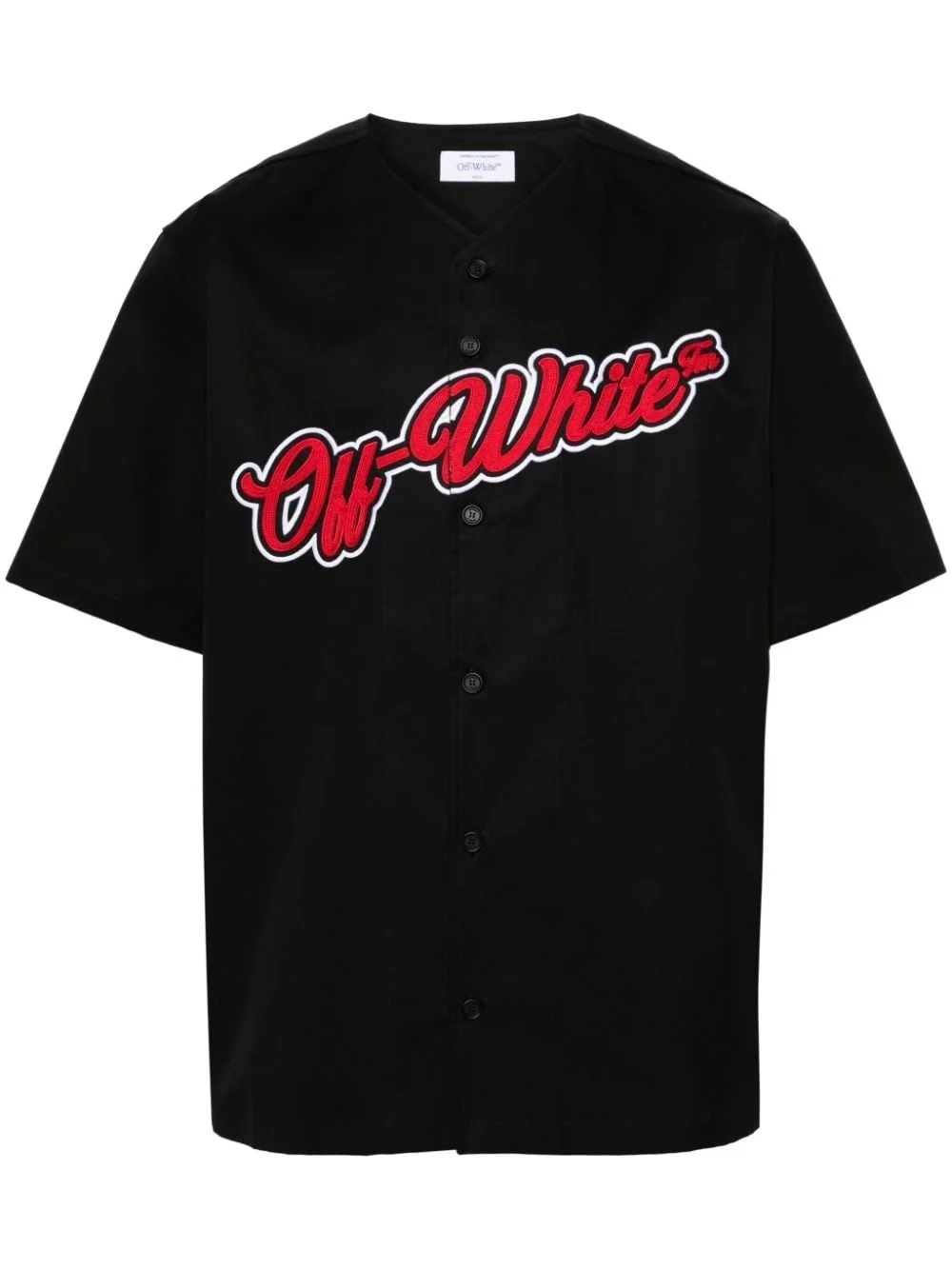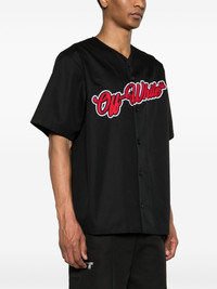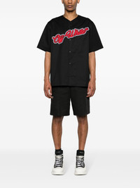 logo-embroidered cotton shirt Cut to resemble a baseball jersey, this Off-White shirt is appliqued with the brand's logo and the number 23, a reference to Michael Jordan’s Bull’s number, in contrasting red and white threads. Highlights - Black - Cotton - Gabardine weave - Embroidered logo to the front - Embroidered number to the rear - V-neck - Front button fastening - Short sleeves - Straight hem Made in Italy Composition Polyester 100%, Cotton 100% SIZE & FIT Model measurements Height 6 ft 2 in(1.87 m) Bust/Chest 36.22 in(92 cm) Hips 37 in(94 cm) Waist 27.95 in(71 cm) FittingInformation Designed for a boxy fit, intended for a loose fit throughout Made from a midweight non-stretch fabric, this piece offers minimal elasticity when worn This piece fits true to size – take your usual size Washing instructions Machine Wash