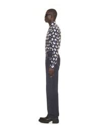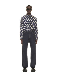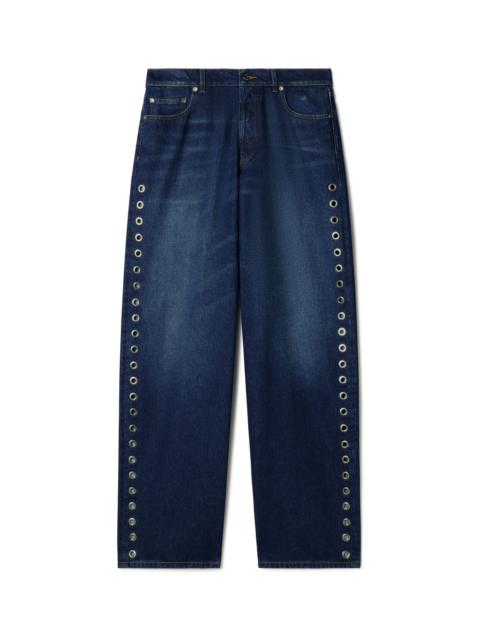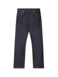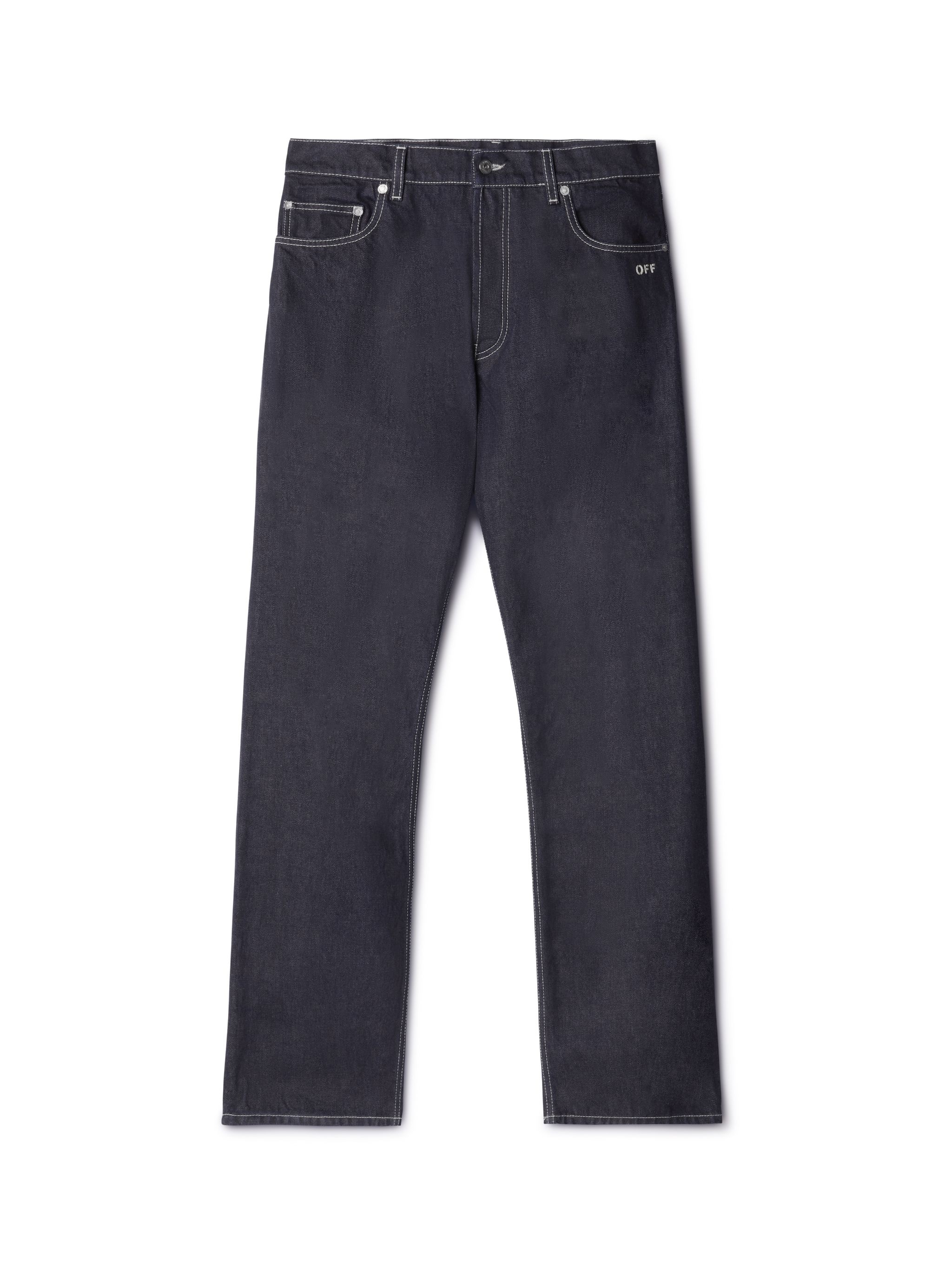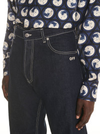 Dark denim jeans with OFF script in white at side pocket.Two side pockets and flat pockets at back.Belts detail loop.White frontal button as closure. MATERIALS Outer: 100% Cotton Lining: 65% Polyester Lining: 35% Cotton FITTING Model Daniel Christian wears size 32 Height 6' 1" (186 cm) Chest: 34" (87 cm) Hips: 35" (90 cm)