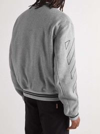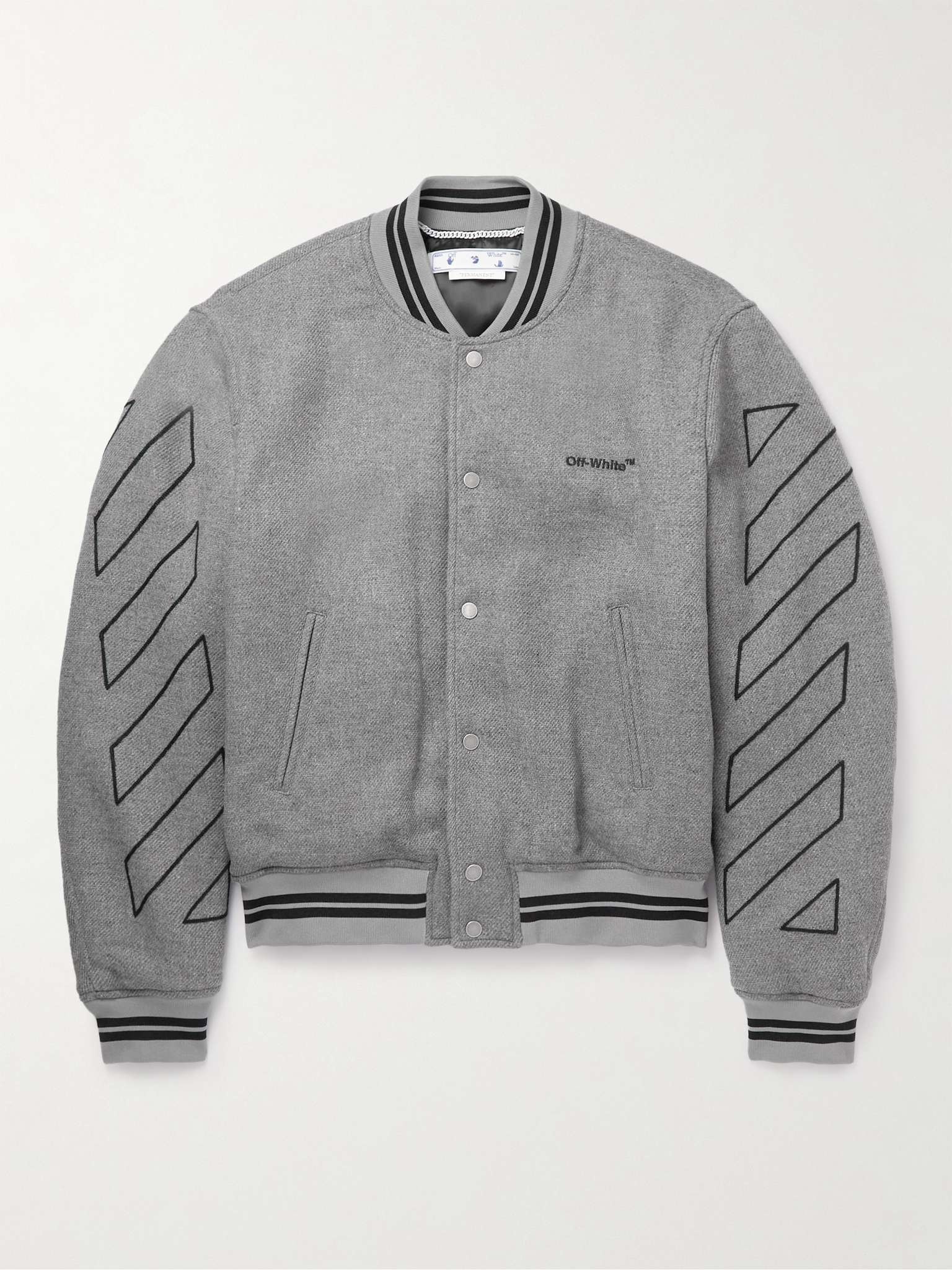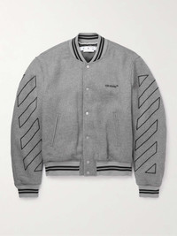 Off-White's bomber jacket stays true to classic varsity styles. Cut with dropped shoulders, this padded version features diagonal shapes along the sleeves and a neat logo at the chest. It's finished with ribbed trims and smart snap fastenings. Size & Fit - Fits true to size. Take your normal size - The model is wearing a size larger to achieve the runway look - This regular cut jacket is designed for a comfortable fit - Mid-weight, non-stretchy fabric - Model wears a M - Model measures: chest 36"/ 92cm, height 6'2"/ 188cm Details & Care - Grey mélange twill - Snap fastenings - 38% cotton, 32% wool, 14% acrylic, 11% polyamide, 5% other fibres; trim: 97% polyamide, 3% elastane; lining: 52% viscose, 48% cupro; padding: 100% polyester - Dry clean - Made in Italy
