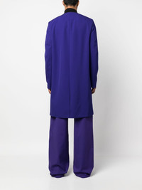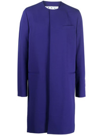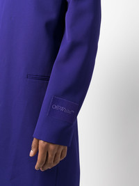 logo-patch single-breasted coat Off-White's bold aesthetic is highlighted in this single-breasted coat, imagined in a deep purple hue for SS23. The garment is subtly adorned with a tonal logo patch for a signature touch. Highlights - Electric purple - Wool - Logo patch at the sleeve - Round neck - Concealed front fastening - Long sleeves - Knee-length - Straight hem Made in Italy Composition Outer: Wool 100% Lining: Viscose 100%, Cotton 100% SIZE & FIT Model measurements Height 6 ft 2 in(1.88 m) Bust/Chest 36.61 in(93 cm) Hips 37.79 in(96 cm) Waist 28.74 in(73 cm) FittingInformation Designed to be unstructured, offering a loose fit throughout The vented hem offers movement at the rear Made from a midweight non-stretch fabric This piece fits true to size – take your usual size