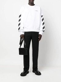 logo-print cotton sweatshirt In line with Off-White's branding focused aesthetic, this cotton sweatshirt is finished with a logo printed at the chest and the brand's diagonal stripe print at the sleeves. Imported Composition Cotton 100% SIZE & FIT Model measurements Height 6 ft 1 in(1.86 m) Bust/Chest 34.64 in(88 cm) Hips 35.43 in(90 cm) Waist 27.16 in(69 cm) FittingInformation This piece fits true to size. We recommend you get your regular size Cut for a loose fit Made with a mid-weight fabric Measurement CHEST 59.84 in(152 cm) SLEEVE LENGTH 27.16 in(69 cm) Shoulder Width 27.55 in(70 cm) LENGTH 25.19 in(64 cm) Washing instructions Machine Wash