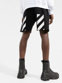 logo-print cotton track shorts logo-print cotton track shorts from OFF-WHITE featuring black/white, cotton, embroidered logo, diagonal stripe print, high waist, elasticated waistband, two side inset pockets and knee-length. Imported Composition Cotton 100% SIZE & FIT Model measurements Height 6 ft 3 in(1.9 m) Bust/Chest 35 in(89 cm) Hips 36.2 in(92 cm) Waist 28.7 in(73 cm) FittingInformation This piece fits true to size. We recommend you get your regular size Designed for a slim fit at the waist and loose over the leg Made with a mid-weight fabric