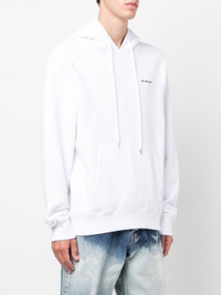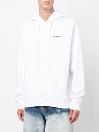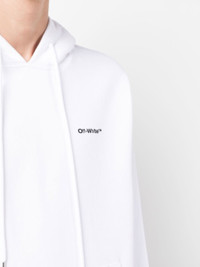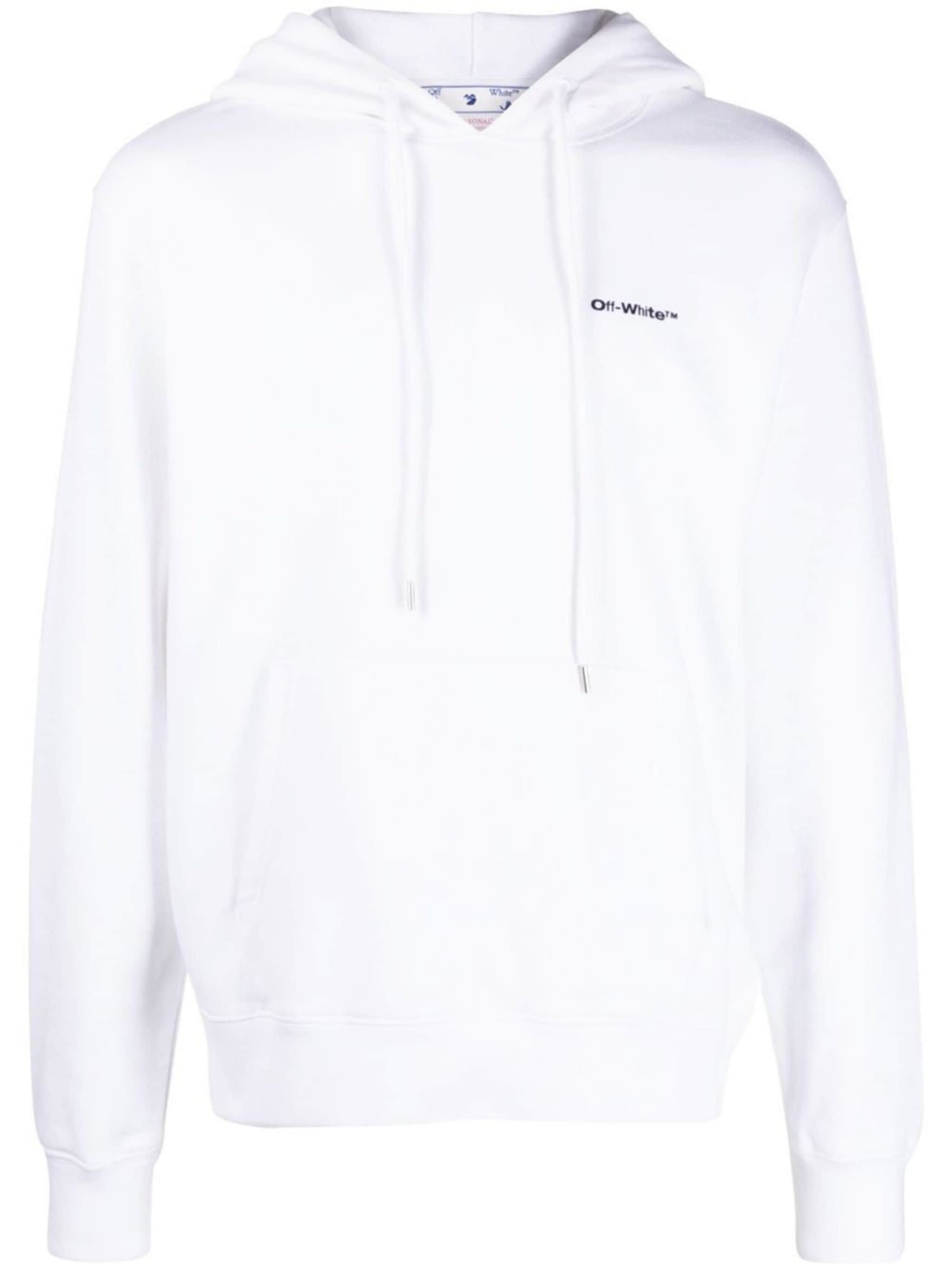 logo-print drawstring hoodie from OFF-WHITE featuring white, cotton, logo print at the chest, drawstring hood, long sleeves and graphic print to the rear. Size & Fit Model Measurements: Height: 1.87 m Bust/Chest: 91.0 cm Hips: 93.0 cm Waist: 73.0 cm Model wears size M Fabric and Care Designer Style ID: OMBB097F22FLE0150110 Designer Colour: 0110 WHITE BLACK Composition: Cotton 100% Washing instructions: Machine Wash Made in Portugal