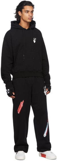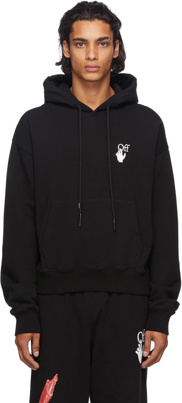 Long sleeve French terry hoodie in black. Drawstring at hood. Printed logo in white at chest. Kangaroo pocket at waist. Rib knit cuffs and hem. Graphic printed in multicolor at back. Supplier color: Black/White