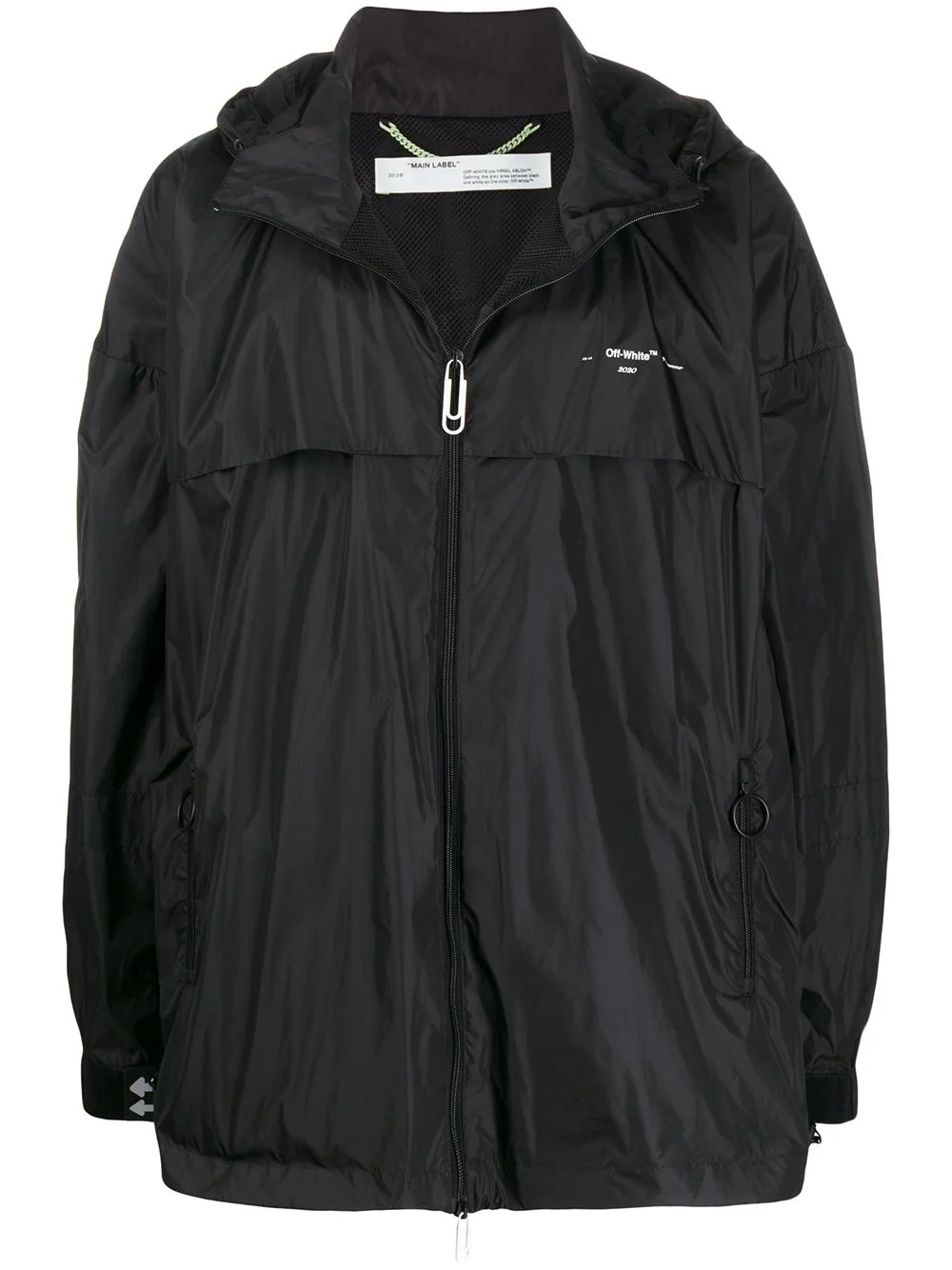 logo print lightweight jacket Is there a better way to stay protected against adverse weather conditions than wearing Off-White? We don't think so. This logo print lightweight jacket won't let that crazy windy even gets near you. Trust Off-White powers. Featuring a hood, a funnel neck, a front zip fastening, a printed logo to the front, long sleeves, elasticated cuffs, front zipped pockets and a lightweight construction. Imported Composition Polyamide 100%, Polyester 100%