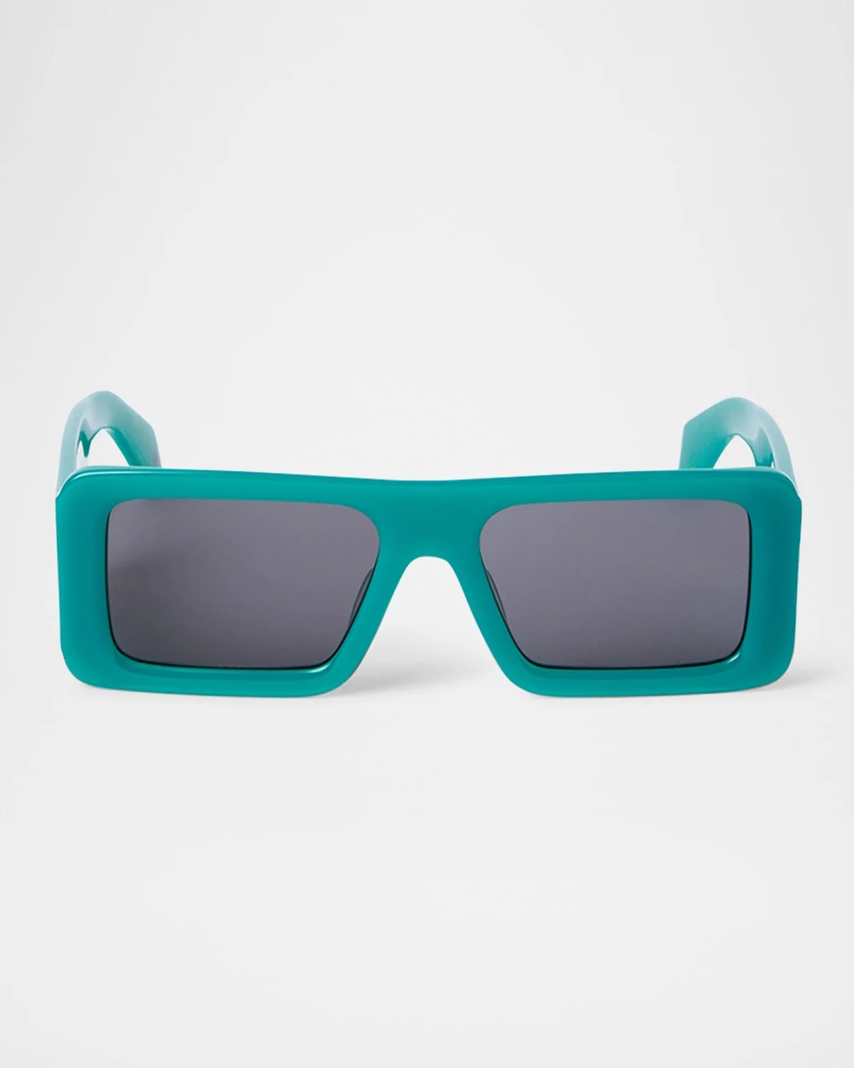 - Off-White "Troy" rectangle sunglasses in acetate - Lens/bridge/temple (in mm): - 55 - 18 - 145 - Features thick, tapered arms with an allover Arrow motif - Solid-color lenses - Saddle nose bridge - Curved temple tips - Acetate - 100% UVA/UVB protection - Made in Italy - Proposition 65 warning for California residents
