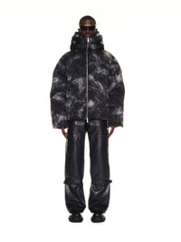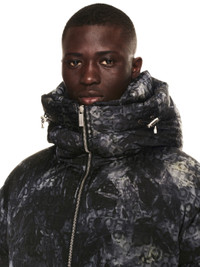 Black and white puffer with OFF balck script logo as a patter.Silver frontal zip closure.Turtleneck collar with zip silver details. Regular fit. MATERIALS Lining: 100% Polyester 100% Polyamide FITTING Model Maib Diop wears size M Height 6' 2" (189 cm) Chest: 34" (87 cm) Waist: 25" (65 cm)
