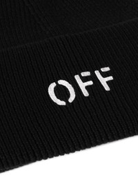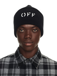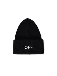 Black beanie with OFF logo script in white at front. MATERIALS 85% Cotton 15% Cashmere FITTING Bust 0cm Height 0cm Hips 0cm Waist 0cm