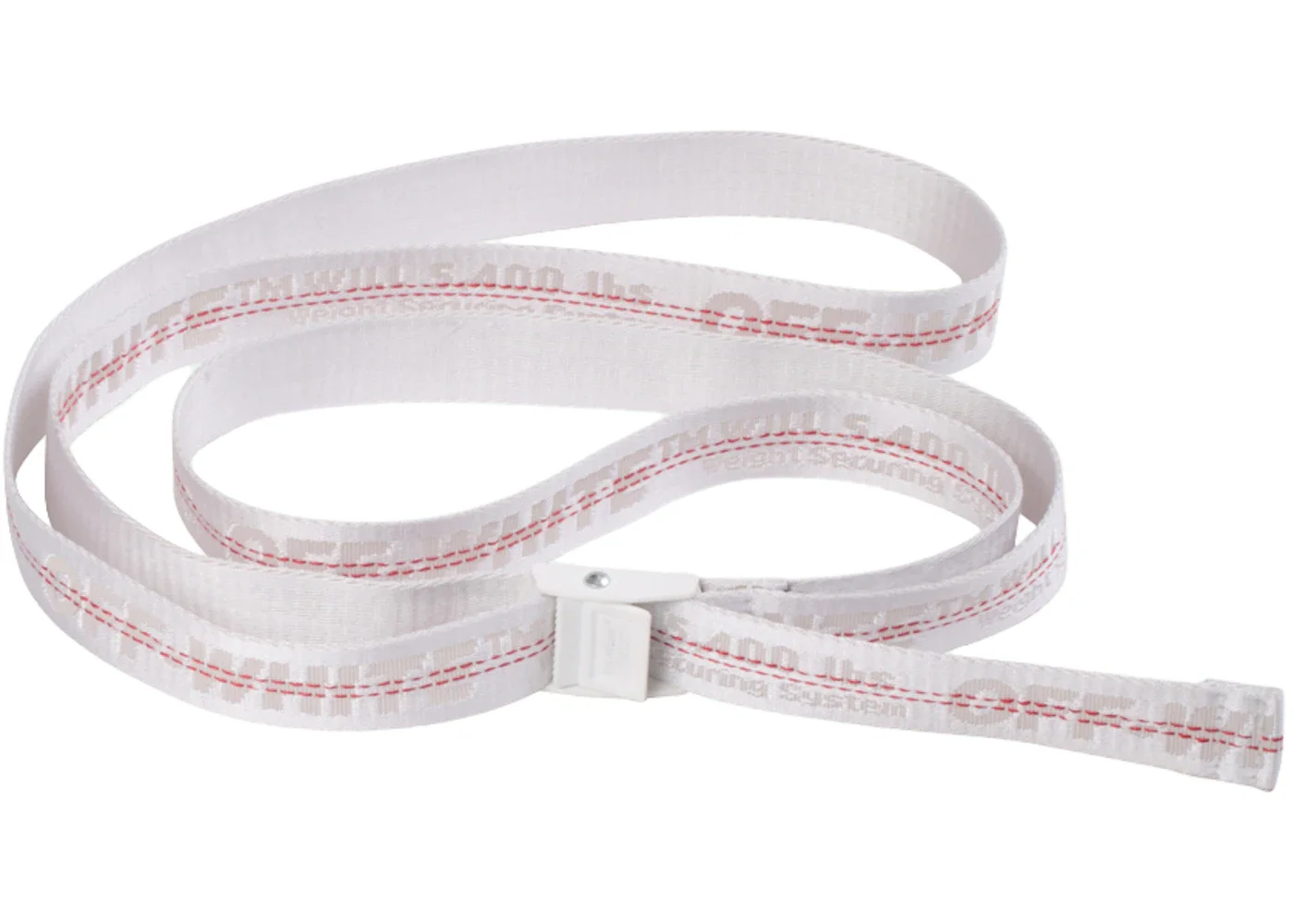 The OFF-WHITE Mini Industrial Belt (SS19) White arrives in a durable build adorned by contrasting white and red tints and bold OFF-WHITE branding across its length. The material used in the construction of the OFF-WHITE Mini Industrial Belt comprises 60% Polyamide and 40% Polyester. It ensures the durability and tensile strength of the belt. The primary colorway of the accessory is contrasted with some red hits accents. The middle of the belt features two red stitch lines that run from tip to tip. Besides beautifying the monochrome shade, they reinforce the Polyamide material. Following the steps of the dominant color, the plastic buckle closure of this belt is also white. What makes the OFF-WHITE Mini Industrial Belt (SS19) White outstanding? We love the jacquard branding embellishing the whole length of the belt. It features OFF-WHITE names alongside "Securing System" and "400lbs" writing. The belt was released during Spring/Summer 2019 for $190. - Season SS19 - Color White - Retail Price 190 - Featured false