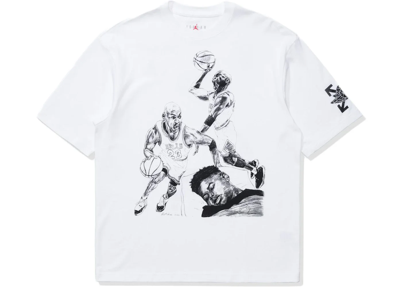 This Off-White x Jordan T-shirt dropped in February of 2021, nearly one whole year after the two brands came together for an NBA All-Star Weekend collaboration in 2020. Unlike the other two pieces released as a part of this capsule, this Off-White x Jordan T-shirt didn't mimic the design of its predecessor. Instead, this t-shirt features detailed graphics of a young man dreaming about Michael Jordan on the front. On the back of the t-shirt, the story progresses and the young man is now dreaming of himself as Michael Jordan, dunking through an Off-White logo. This Off-White x Jordan T-shirt was released on February 8th, 2021, at the retail price of $100 USD. - Season SS21 - Color White - Release Date 2021-02-08 - Style DB4300-100 - Retail Price 100 - Featured false