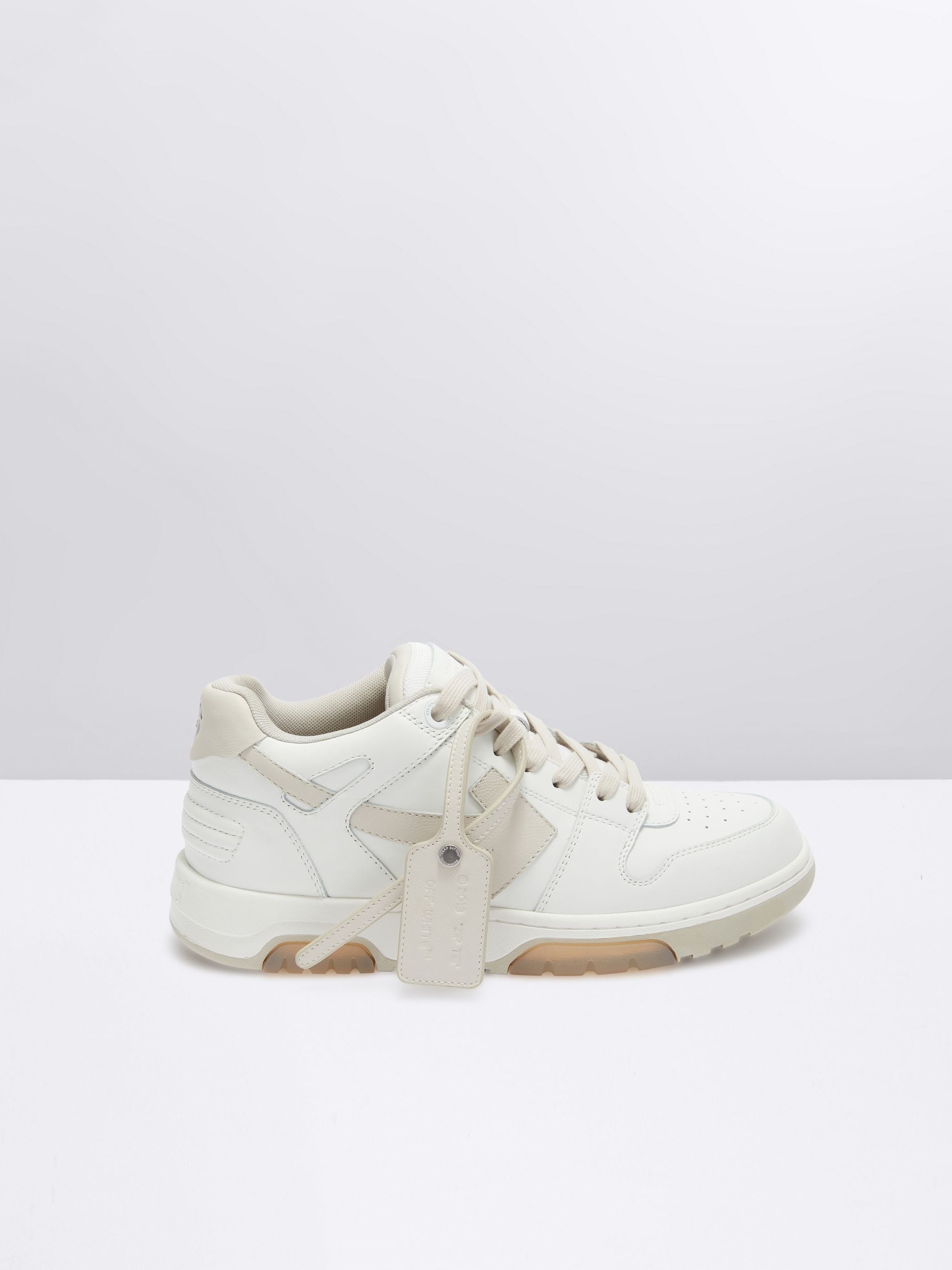 Low "Out of office" sneakers in white with beige arrow at side. Off-White™ logo at back. Beige and white rubber sole. White lace-up closure. Virgil Abloh—Off-White’s founder and creative director—wanted to create a tennis shoe with a late 1980’s and early 1990’s aesthetic, that could be worn all-day-every-day. The result: a low-top silhouette with hybridized street, basketball and running influences. The “OUT OF OFFICE” sneaker features a contrasting outsole with translucent gel insets, classic perforated toe vamps, a ribbed heel and a recontextualized logo. Please note that this item should not come into contact with water. MATERIALS Outer: 100% Leather Lining: 14% Leather Lining: 86% Polyester Sole: 100% Rubber FITTING Bust 0cm Height 0cm Hips 0cm Waist 0cm