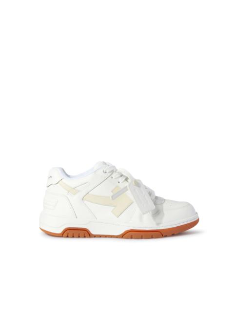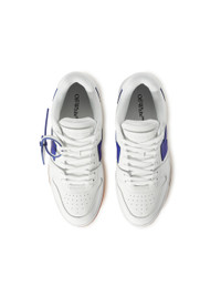 White low Out Of Office leather sneakers featuring white label and dark blue arrows at sides. White and beige rubber sole. MATERIALS Lining: 14% Leather Lining: 86% Polyester Outer: 11% Polyester Outer: 89% Leather Sole: 100% Rubber FITTING Bust 0cm Height 0cm Hips 0cm Waist 0cm