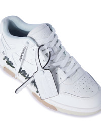 Low white leather Out Of Office sneakers with tonal arrows at sides. Black "FOR WALKING" script at side. White label detail. Tonal laces and rubber sole. MATERIALS Lining: 86% Polyester Lining: 14% Leather Outer: 11% Polyester Sole: 100% Rubber Outer: 89% Leather FITTING Bust 0cm Height 0cm Hips 0cm Waist 0cm