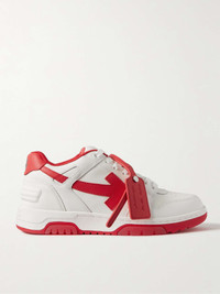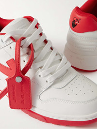 Off-White's 'Out of Office' sneakers reference classic tennis shoes. They have contrasting outsoles with cushioning translucent gel insets and are topped off with the brand's signature hanging tag threaded through the laces. Size & Fit - Fits true to size. Take your normal size - Only available in full sizes, go up to the nearest whole size if you take a half size - European sizing Details & Care - White and red leather (Calf) - Heel tabs, padded collars, designer emblems, perforations, mesh linings, rubber soles - Lace-up - Style number: OMIA189S22LEA0010125
