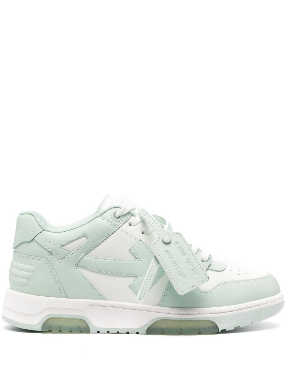 Out of Office sneakers Highlights - White/mint green - Leather - Panelled design - Front lace-up fastening - Branded heel counter - Logo patch at the tongue - Signature arrows motif - Signature zip tie tag - Perforated toebox - Round toe - Branded insole - Flat rubber sole Imported Composition Lining: Fabric 100% Outer: Polyester 100%, Leather 100% Sole: Rubber 100% SIZE & FIT Measurement HEEL 1.37 in(3.5 cm) Sole height 0.98 in(2.5 cm)