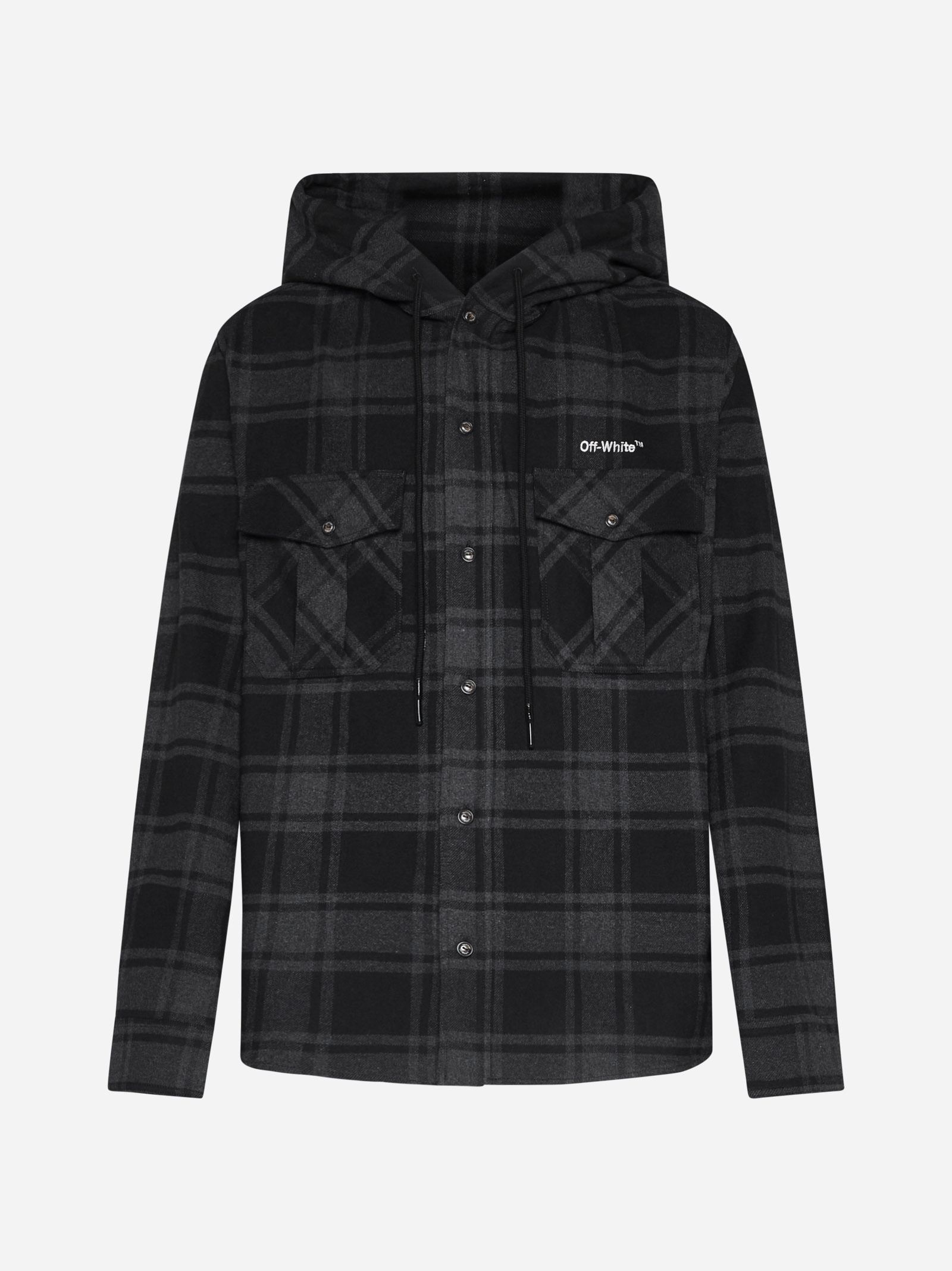 Off-White's Outline Arrow overshirt in cotton blend flannel featuring a check motif in shades of black and dark grey, adjustable drawstring at the hood, front and cuffs press studs buttoning, chest pockets + logo, Arrow logo embroidered on the back and rounded hem. Color: Dark grey Size and fit: Model is 194 cm tall and wearing a size L Composition: 80% cotton 20% polyester Country of manifacture: Italy ID designer: OMGA225C99FAB001-0701
