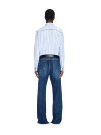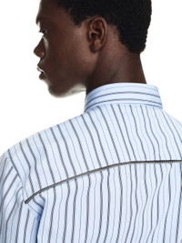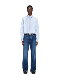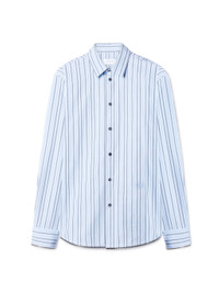 Light blue long sleeves shirt featuring vertical stripe pattern. Buttons up closure and classic collar. MATERIALS 100% Cotton FITTING Height 6' 1" (186 cm) Chest: 34" (87 cm) Waist: 25" (65 cm)