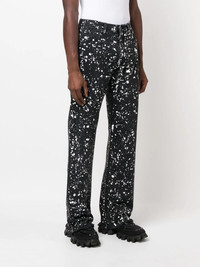 paint splatter print jeans Off-White's artistic side is expressed on these raw-cut hem jeans that draw the eye with their contrast paint splatter print. Made in Italy Composition Cotton 100% SIZE & FIT Model measurements Height 6 ft 2 in(1.88 m) Bust/Chest 36.61 in(93 cm) Hips 35.82 in(91 cm) Waist 27.95 in(71 cm) Washing instructions Machine Wash