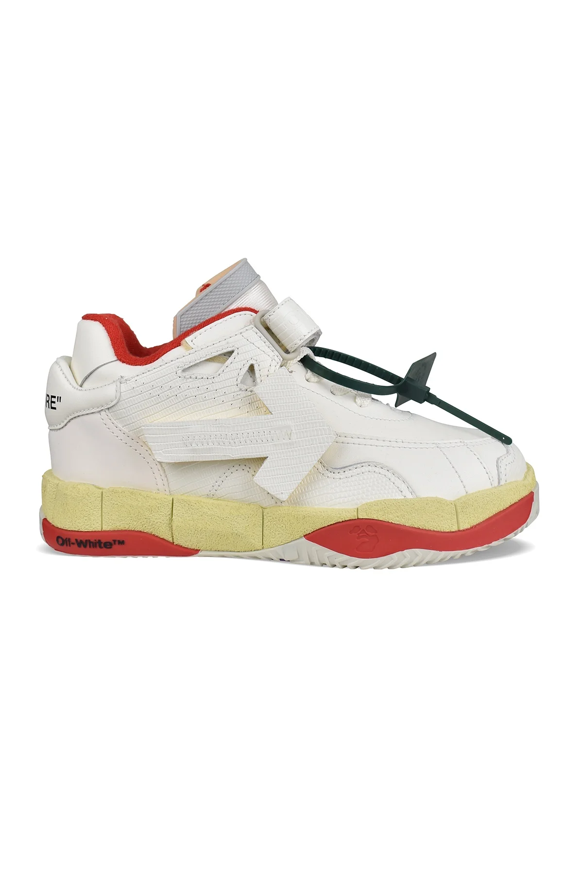 Off-White "Puzzle Couture" sneakers in white leather. White arrow on side. Beige, red and purple rubber sole with Off-White logo. White lace-up closure. Scratch fastening at the ankle with Off-White logo. Iconic green tag on one side. Counter with "Haute" and "Couture" lettering in black.