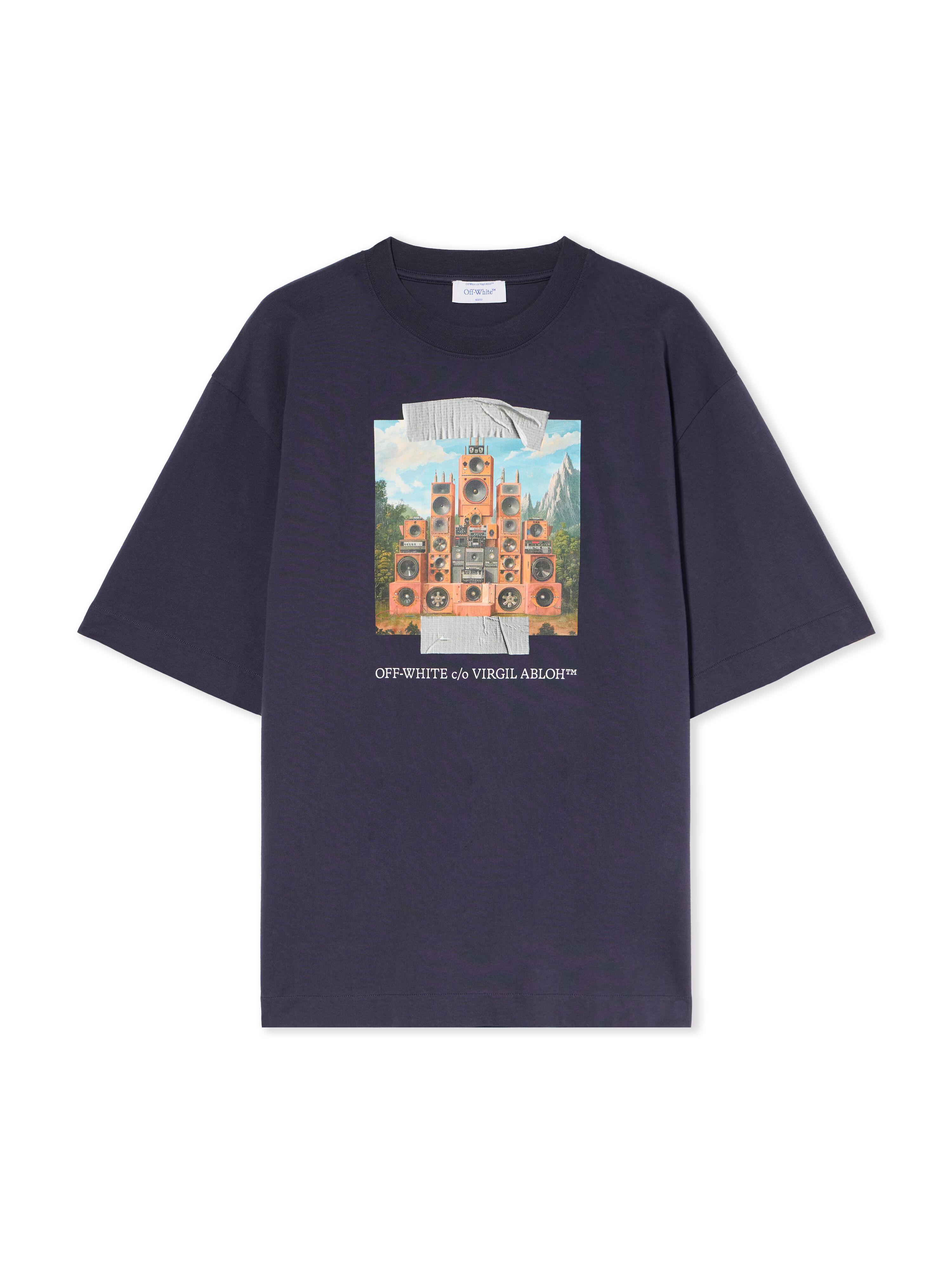 Crafted from premium cotton, this short sleeve tee exemplifies Off-White™'s commitment to urban-inspired design, featuring striking graphical elements on the front and rear. - Premium cotton construction - Front graphic with speaker motif - Rear graphic with graffiti train design - Short sleeves for versatile wear - Ribbed crew neckline - Signature Off-White™ branding on front DETAILS - Material: 100% Cotton, Rib Details: 5% Elastane 95% Cotton - Code: OMAA120F25JER0044901