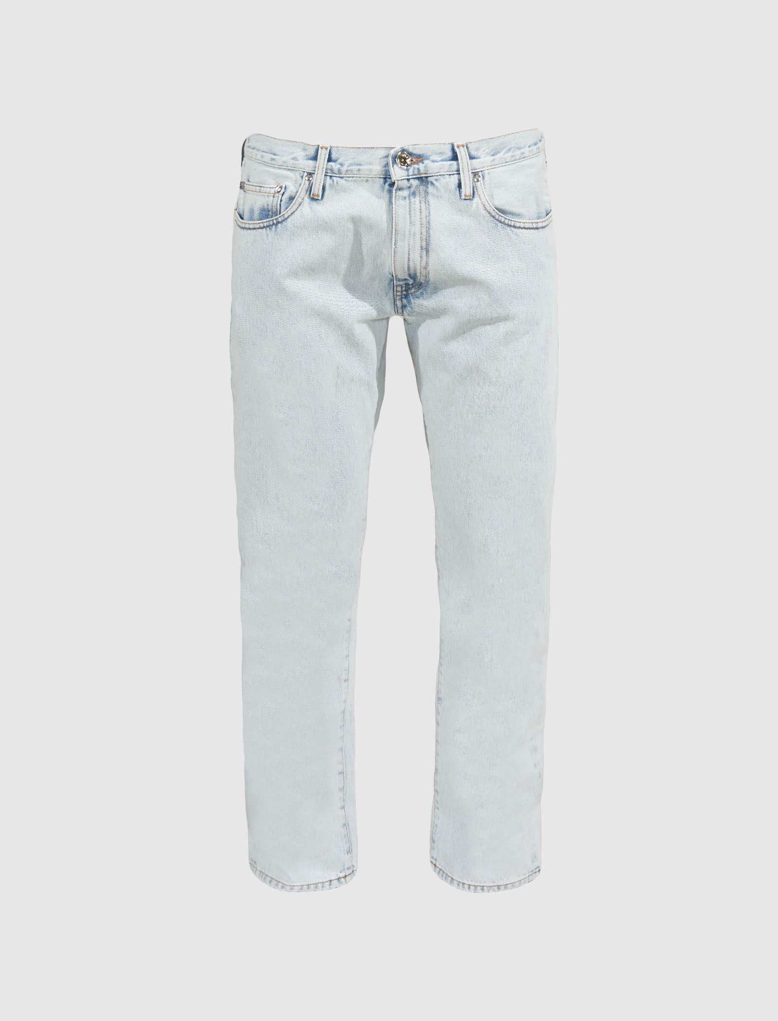 Slim fit denim jeans. 2 curved welt side pockets. Coin pocket inside the left pocket. 2 back patch style pockets. Zippered front closure with a button fly. Printed graphic logo on the back right patch pocket. Leather patch on the back of the waistband. Belt loops around the waist. - 100% Cotton SKU: OMYA148C99DEN0054001