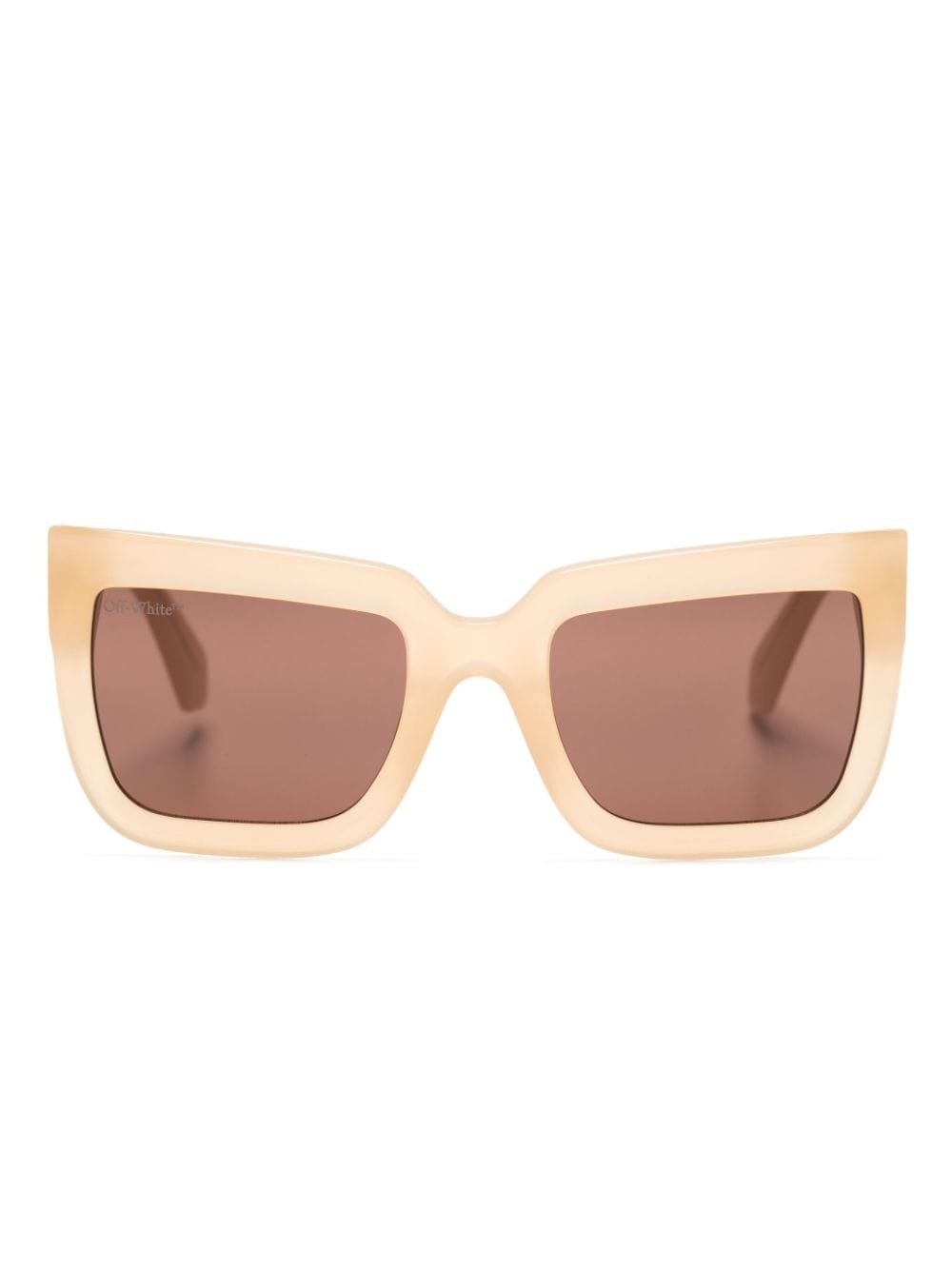 square-frame tinted sunglasses White 'OFF' lettering adorns the arm of these Off-White sunglasses, reflecting the brand’s penchant for logomania. They’re crafted from pink acetate to a square-frame design and fitted with tinted UV-protective lenses. Highlights - Sand brown - Acetate - Translucent design - Square frame - Brown tinted lenses - Lens decal - Logo-debossed arm - Straight arms - Curved tips - These glasses come with a protective case. Made in Italy Composition Acetate 100% SIZE & FIT Measurement Arm Length 5.7 in(14.5 cm) Bridge Width 0.86 in(2.2 cm) Lens Diameter 2.16 in(5.5 cm) Total Width 5.66 in(14.4 cm)