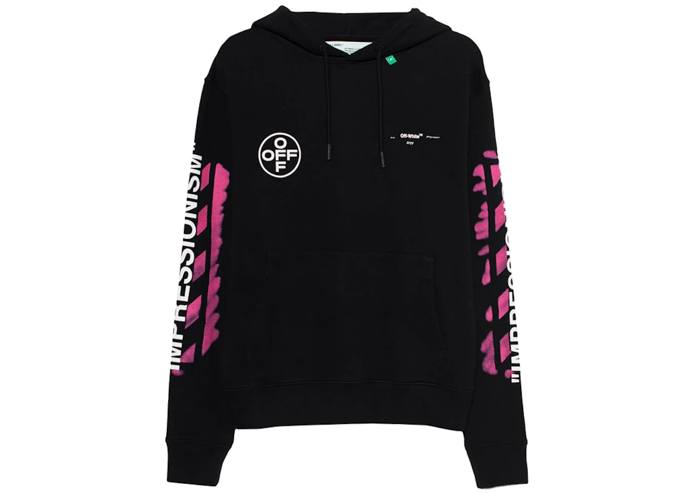 The OFF-WHITE Diag Stencil Hoodie Black/Multicolor arrives in a 100% cotton construction for comfort and a primary black colorway adorned by multicolor patches for style. The hood of the OFF-WHITE Diag Stencil Hoodie features a plain core black colorway, and it displays a drawcord of the same fortified by plastic aglets and a green tag on the seam. White contrasts embellish the chest area, with an encircled "OFF" branding on the right and "OFF-WHITE" detailing on the left. The long sleeves of this apparel usher a multicolor theme, with dark pink imprints plastered from the bicep to the forearm. On both sleeves is a white "IMPRESSIONISM" writing. What do our experts think makes this hoodie stand out? We like the screen-printed diagonal stencil design that takes much of the back. A white "99" motif on the back of the left shoulder contrasts the white and pink tones. The OFF-WHITE Diag Stencil Hoodie Black/Multicolor retailed at $645 when released on June 2nd, 2019. - Season SS19 - Color Black/Multicolor - Retail Price 645 - Featured false