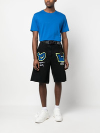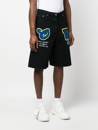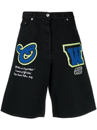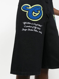 patch wide-leg denim shorts Off-White takes a sporty approach to denim design with these shorts, boldly adorned with varsity patch detailing. The wide-leg pair is finished with a branded embroidery to the front for a signature touch. Made in Italy Composition Cotton 100% SIZE & FIT Model measurements Height 6 ft 2 in(1.88 m) Bust/Chest 36.61 in(93 cm) Hips 35.82 in(91 cm) Waist 27.95 in(71 cm) FittingInformation This piece fits true to size. We recommend you get your regular size Designed for a slim fit at the waist and loose over the leg Made with a mid-weight non-stretch fabric Washing instructions Machine Wash
