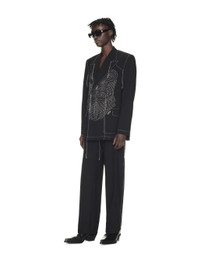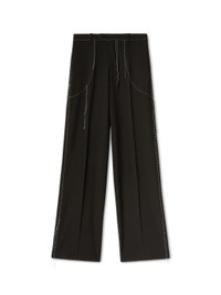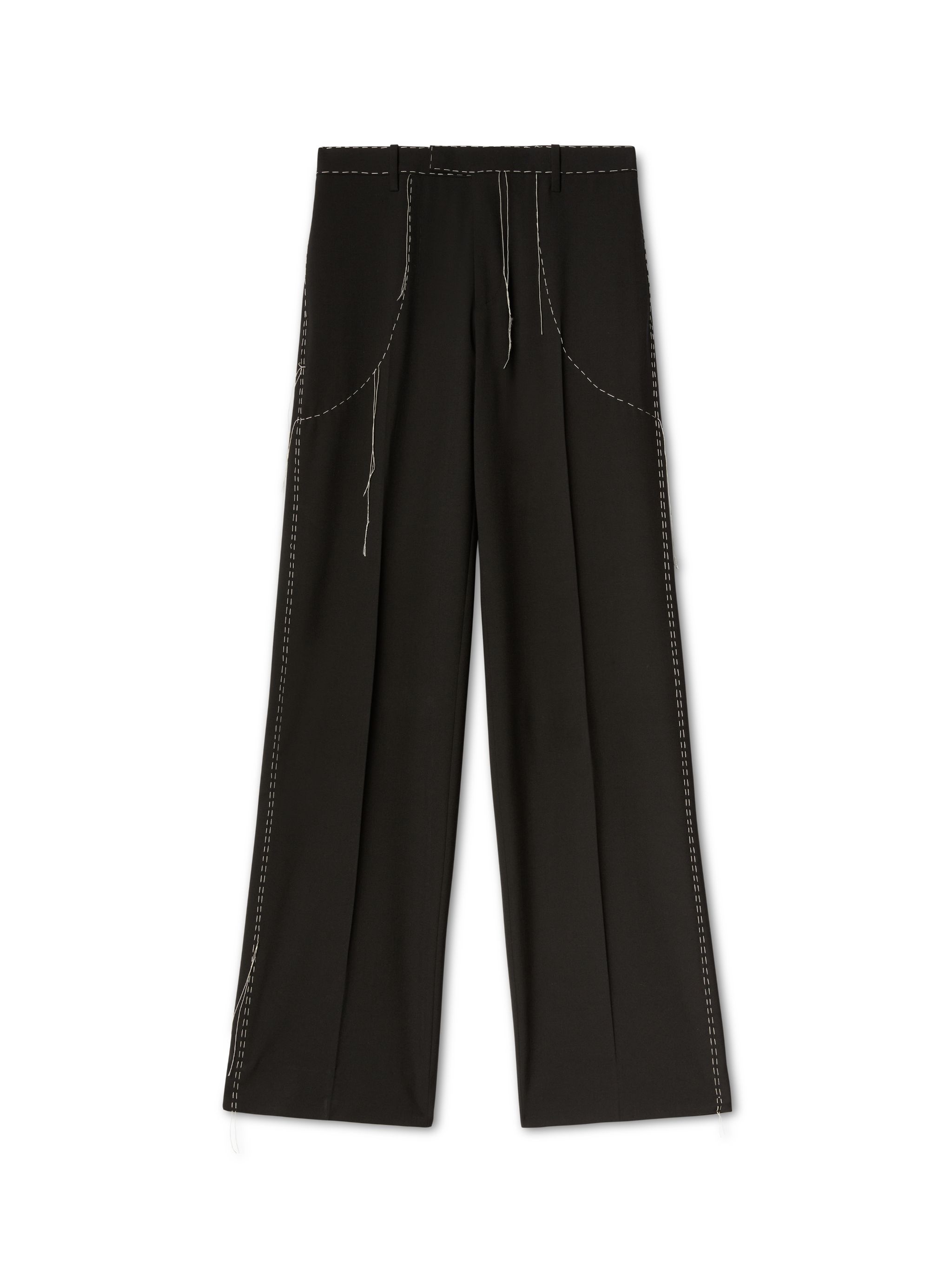Black pant with with outlined details. Two sides pockets. MATERIALS Lining: 48% Cupro Lining: 52% Viscose Outer: 40% Mohair Outer: 60% Virgin Wool FITTING Model Massaer Seck wears size M Height: 6' 1" (185 cm) Chest: 33" (84 cm) Waist: 25" (65 cm)