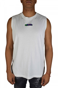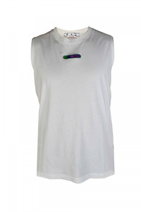 White sleeveless T-shirt Off-White. Black logo printed on the back with leaves around. Off-White logo embroidered on the front in green, blue and pink. Tank top model. Round neck, straight cut. 100% cotton.