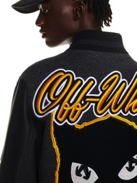 Drak grey varsity with yellow "OW"patches at both side.Frontal closure with buttons.Ribknit and elasticized cuffs. MATERIALS Outer: 100% Leather Outer: 30% Polyamide Lining: 47% Cupro Lining: 53% Viscose Outer: 70% Wool FITTING Model Massaer Seck wears size M Height: 6' 1" (185 cm) Chest: 33" (84 cm) Waist: 25" (65 cm)
