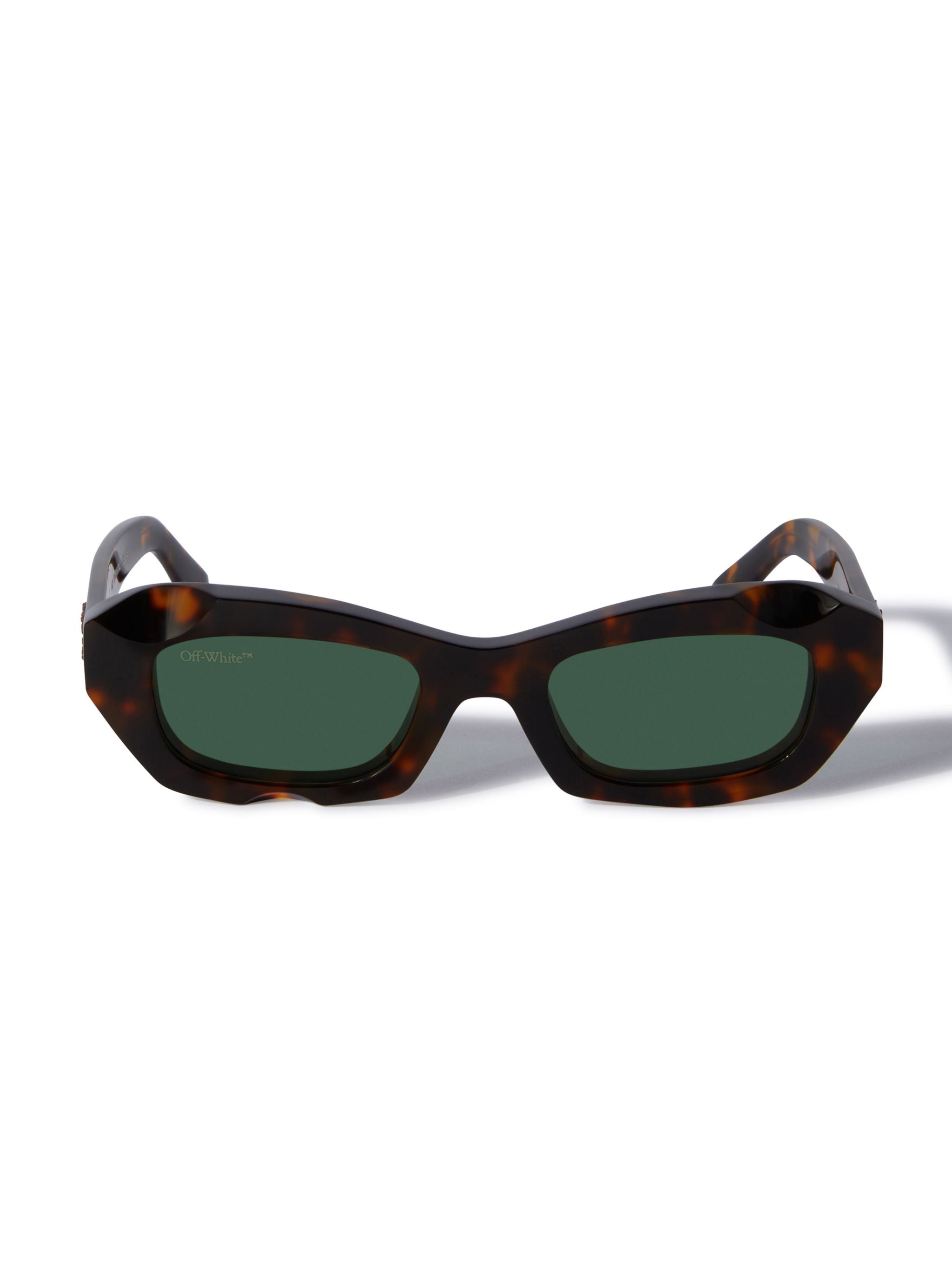 Havana brown acetate tortoiseshell effect signature Arrows motif lens decal rectangle frame green tinted lenses UV-protective lenses straight arms curved tips These glasses come with a protective case. MATERIALS 100% Acetate FITTING Bust 0cm Height 0cm Hips 0cm Waist 0cm