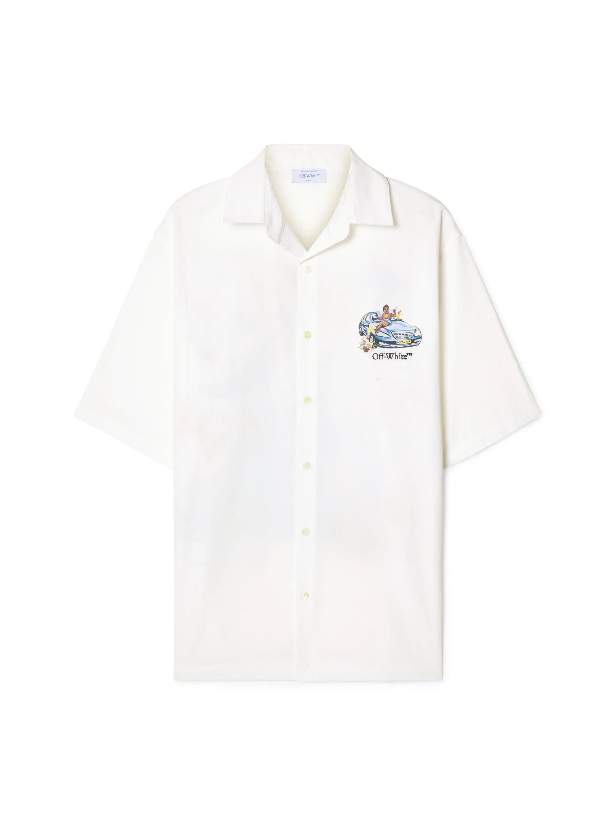 This 100% cotton bowling shirt features a small bookish logo with a cherub and car on the front and a large matching fresco-style graphic and arrow on the reverse. Made in Italy. DETAILS - NALLA WEARS SIZE 48 HEIGHT: 6' (184 CM) BUST: 35” (89 CM) WAIST: 27“ (70 CM) HIPS: 35” (89 CM) - Material:Cotton 100% - Code: OMGG013S25FAB0010187