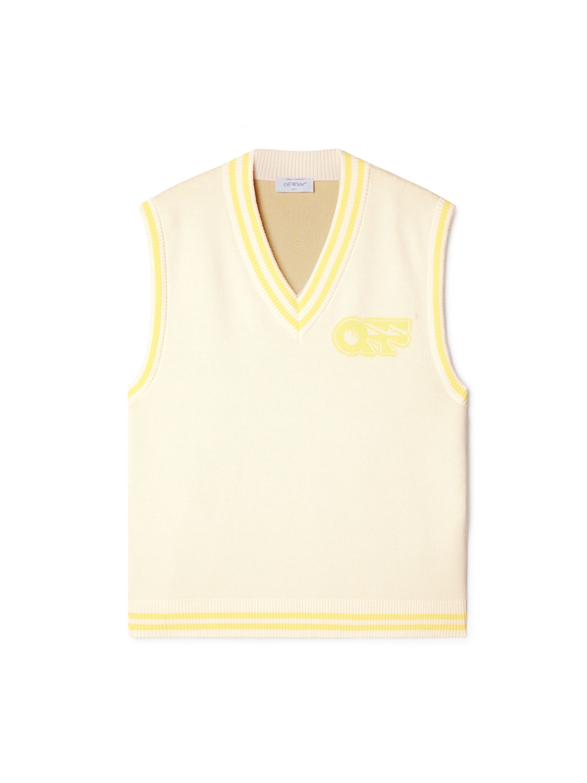 A new golf collection designed in collaboration with Paris Hilinski. This 100% cotton knit golf vest features an OFF logo on the front and the new "ALL IN ONE" golf quote on the reverse. Made in Italy. MATERIALS 100% Cotton FITTING LOUIS WEARS SIZE M HEIGHT: 6' 2” (190 CM) BUST: 35” (89 CM) WAIST: 28“ (72 CM) HIPS: 36” (93 CM)