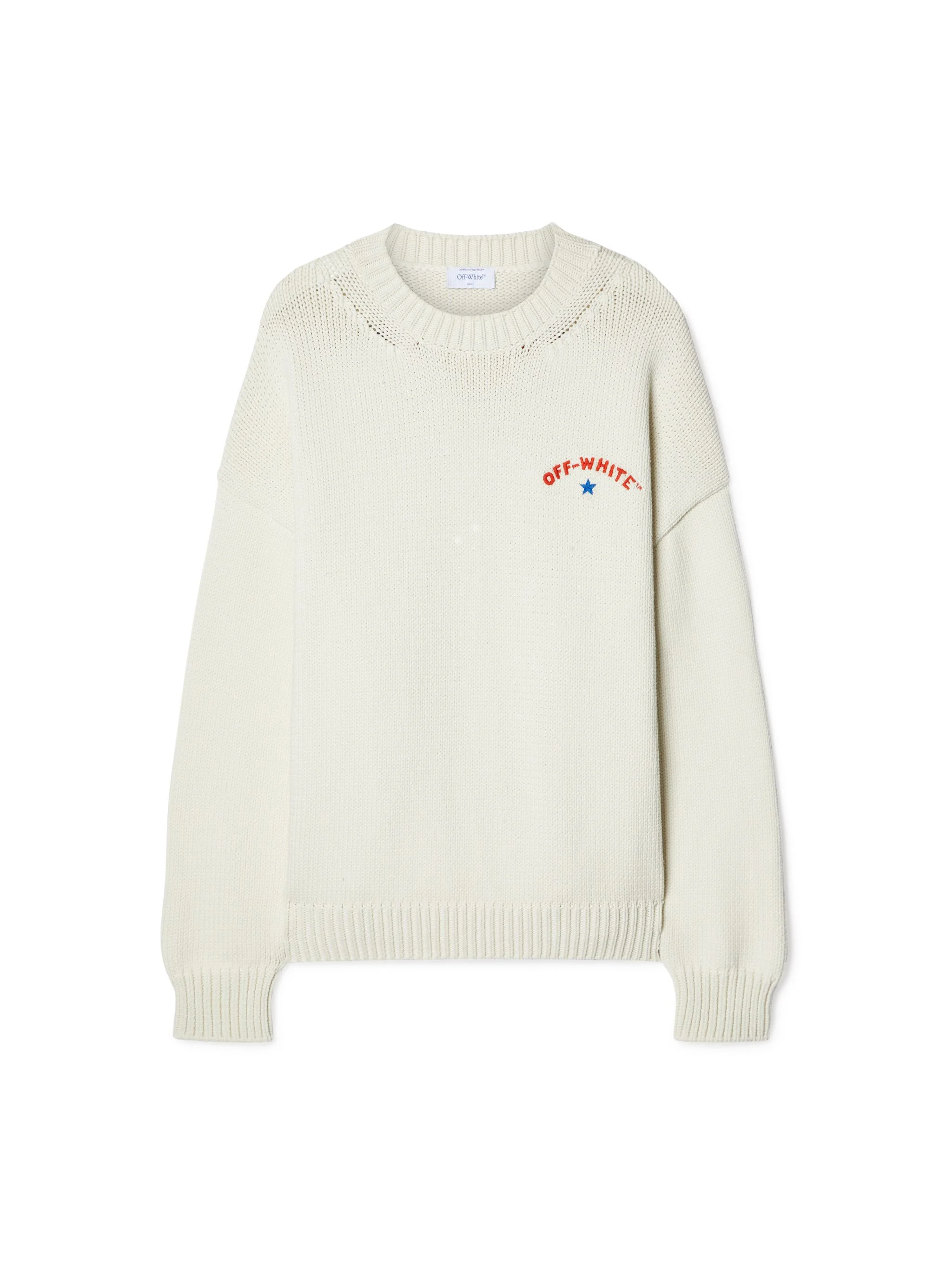 This cotton blend knit crewneck sweater features a small logo and star on the front and a large starred arrow graphic on the reverse. Made in Italy. DETAILS - NALLA WEARS SIZE M HEIGHT: 6' (184 CM) BUST: 35” (89 CM) WAIST: 27“ (70 CM) HIPS: 35” (89 CM) - Material:Virgin Wool 11%, Cotton 57%, Acrylic 50%, Polyamide 32%, Polyester 100%, Wool 50% - Code: OMHE153S25KNI0010B10