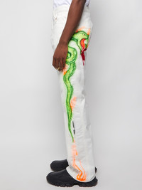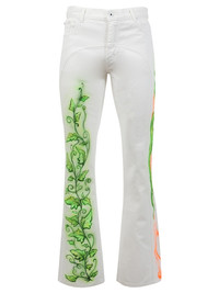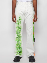 Babybrush contour jeans from Off-White featuring a casual silhouette, long length, classic five-pocket design, belt loops, front button and zip closure, logo patch at the back waist and a contrasting snake and leaf graffiti print throughout. Style these unique pants with a black tee and black boots for a head-turning stylish take to an evening concert fit. Dimensions: Model is 6'1" /185cm and is wearing a size US33 Composition: cotton Care: Dry clean only Brand Style: OMYA104T21DEN0010184