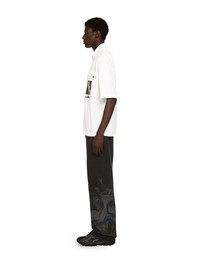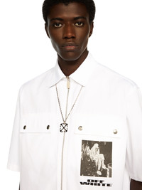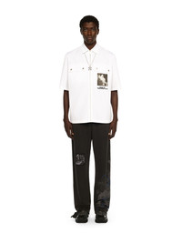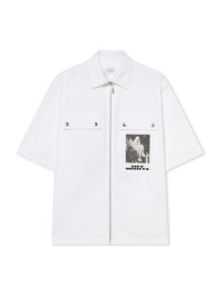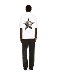 Structured short-sleeve shirt in technical cotton with a concealed zip fastening and striking graphical motifs. - Technical cotton construction - Concealed zip fastening - Short sleeves - Front graphic and text print - Rear star and eagle motif - Point collar - Boxy silhouette - Made in Italy DETAILS - Material: 100% Cotton - Code: OMGG01DF25FAB0030110