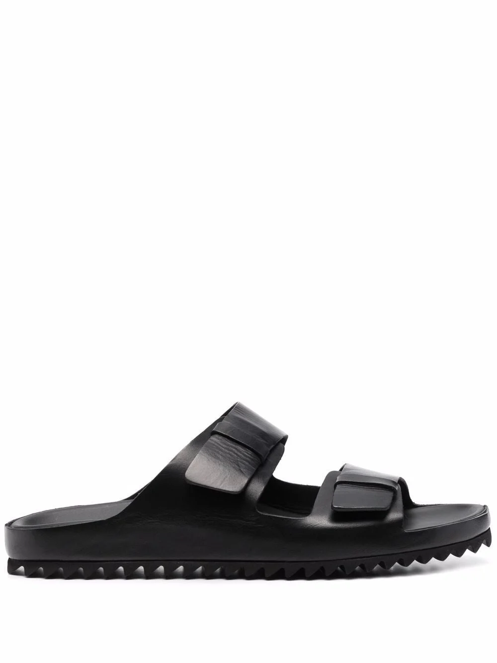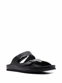 double strap flat sandals black leather open toe slip-on style branded insole flat rubber sole Made in Italy Composition Lining: Leather 100% Sole: Rubber 100% Outer: Leather 100% SIZE & FIT Measurement HEEL 1.18 in(3 cm) Sole height 0.78 in(2 cm)