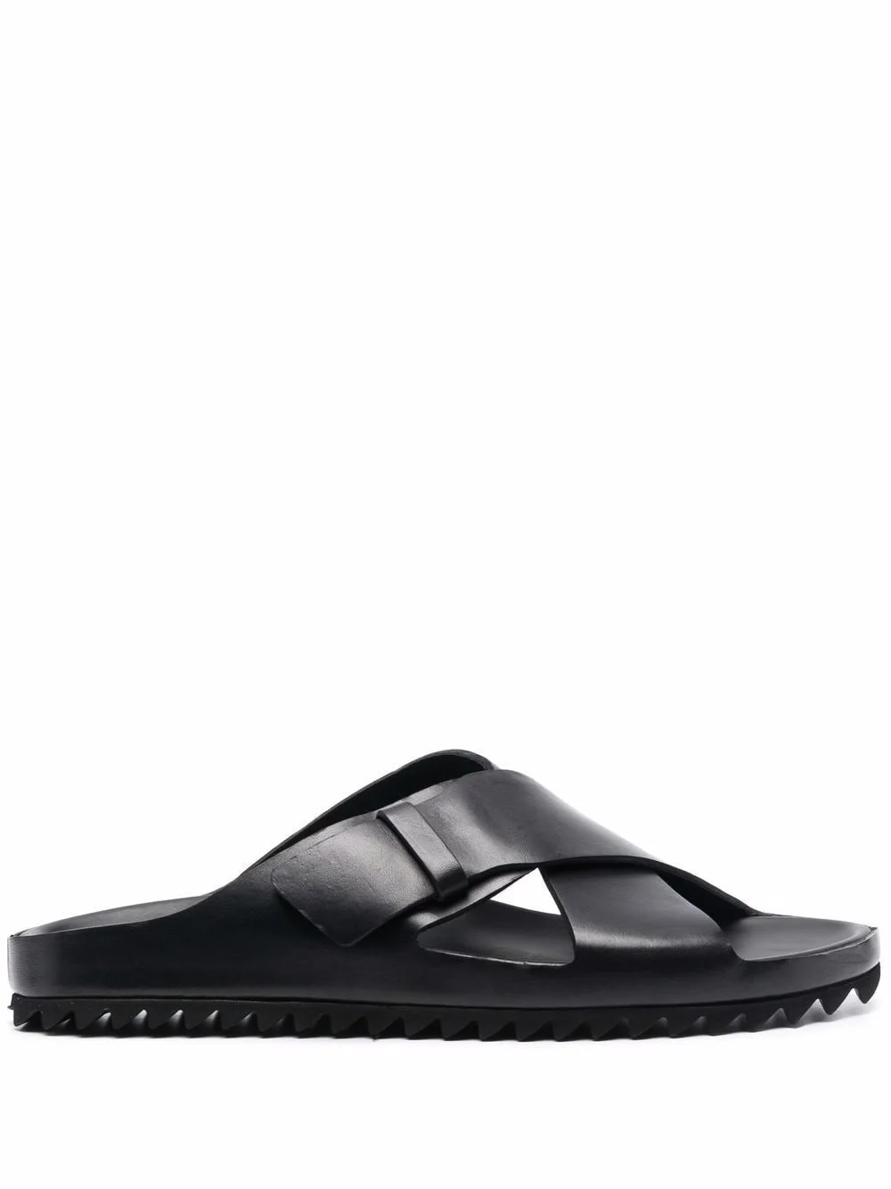 Agora slippers black calf leather/leather slip-on style crossover strap at the toe round toe branded insole flat rubber sole Made in Italy Composition Outer: Calf Leather 100% Lining: Leather 100% Sole: Rubber 100% SIZE & FIT Measurement HEEL 0.78 in(2 cm) Sole height 0.59 in(1.5 cm)