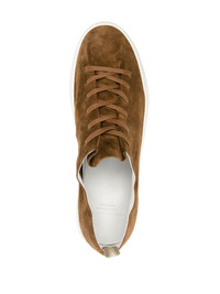 Leggera 001 suede sneakers Birra brown calf suede laser-cut ankle contrast stitching pull-tab at the heel front lace-up fastening round toe branded leather insole flat rubber sole Made in Italy Composition Outer: Calf Suede 100% Sole: Rubber 100% Lining: Calf Leather 100% SIZE & FIT Measurement Sole height 0.98 in(2.5 cm)