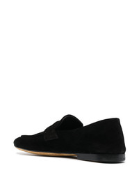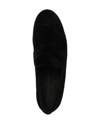 suede penny loafers black leather round toe penny slot branded insole flat rubber sole Made in Italy Composition Lining: Leather 100% Sole: Leather 100% Outer: Suede 100% SIZE & FIT Measurement HEEL 0.39 in(1 cm)